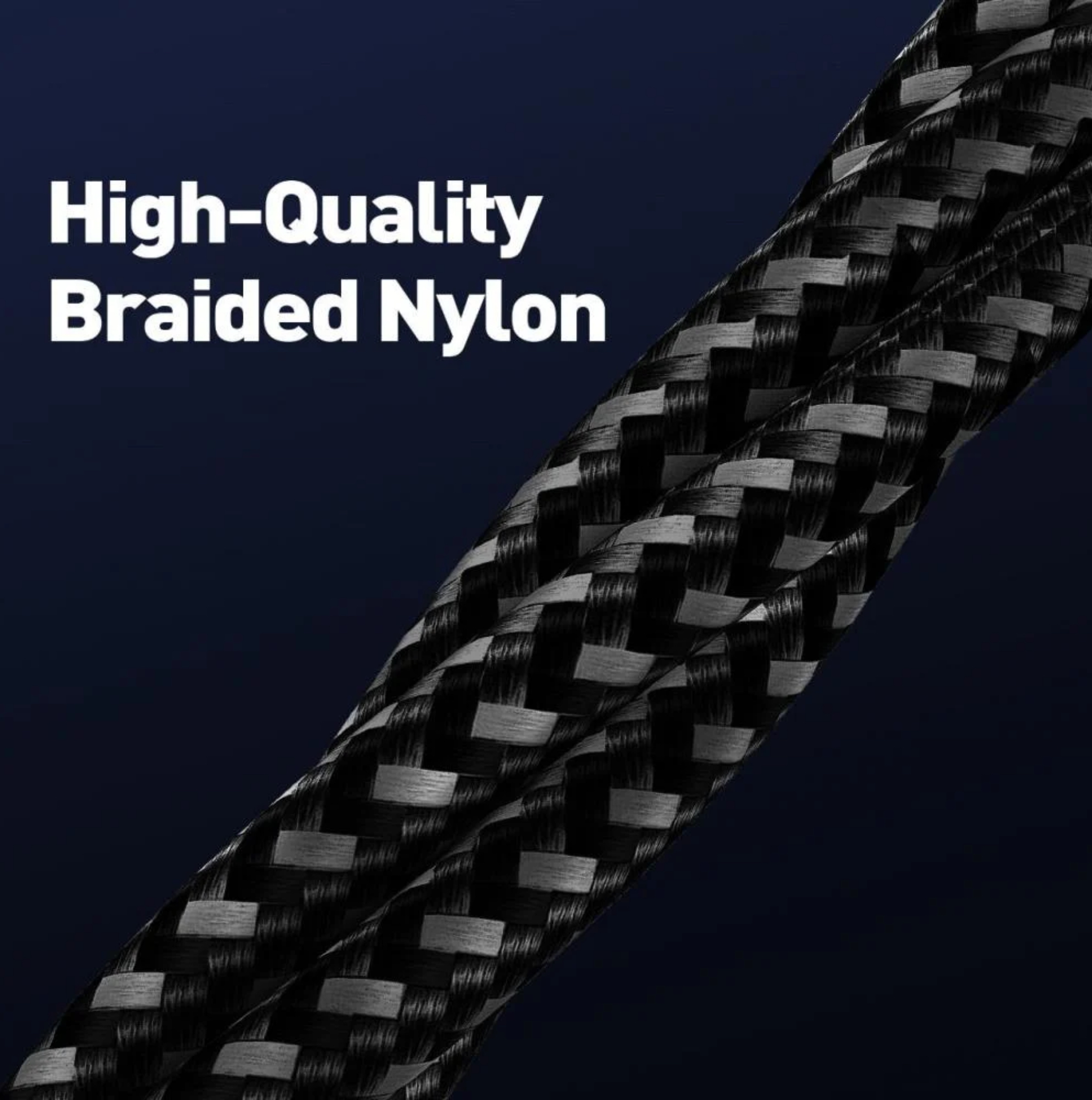 مصمم بطبقة خارجية من النايلون المضفر، مما يمنحه متانة إضافية وقدرة على تحمل الاستخدام الكثيف. يضيف التصميم القماشي لمسة أنيقة، إلى جانب مقاومته للتآكل والتشابك، مما يجعله يدوم لفترة أطول من الكابلات العادية.