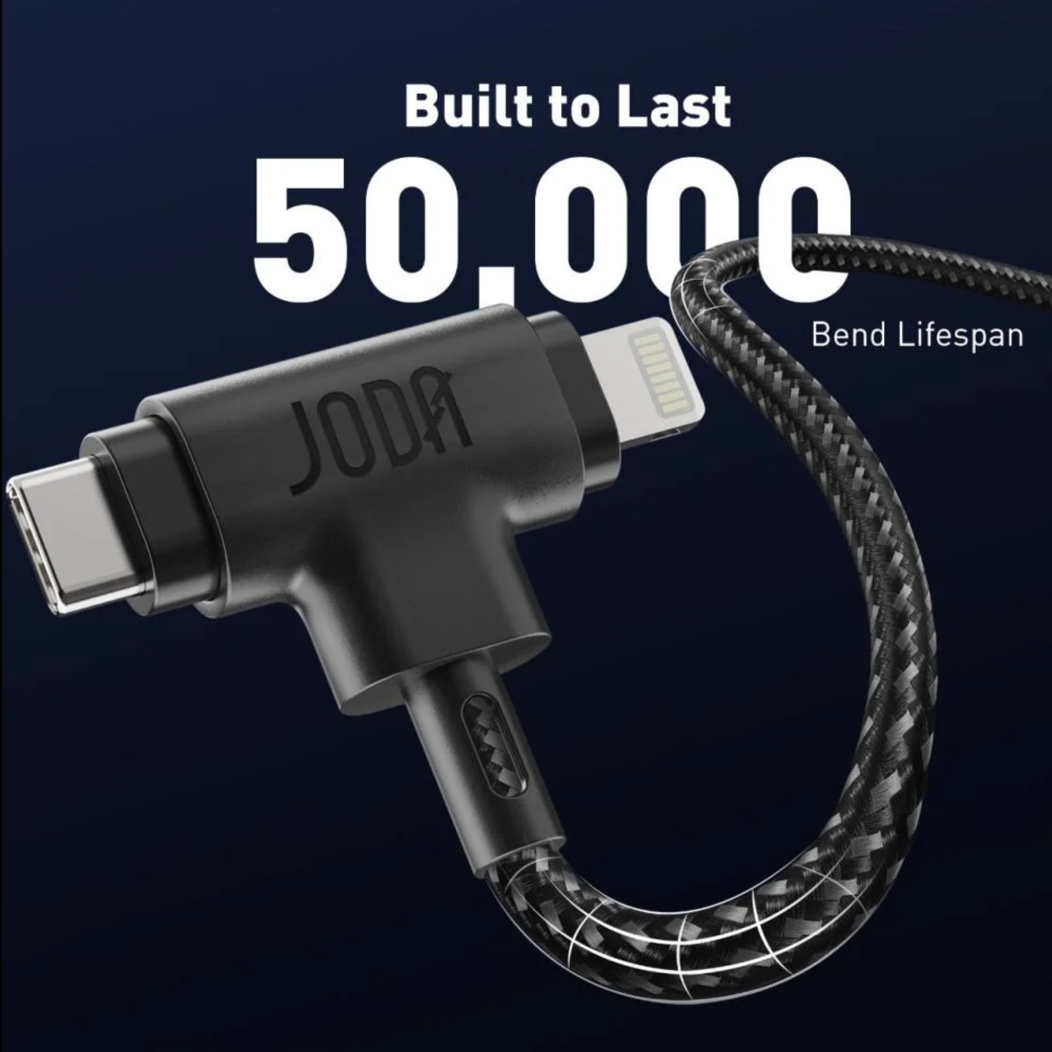 يأتي الكابل بمنافذ مزدوجة تدعم كلاً من USB-C وLightning في تصميم واحد مبتكر، مما يجعله مثاليًا لاستخدامه مع مجموعة واسعة من الأجهزة الذكية. سواء كنت تستخدم هواتف آيفون أو أجهزة أندرويد، فهو يوفر اتصالًا مرنًا وسلسًا.